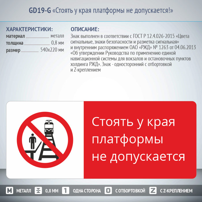 Знак «Стоять у края платформы не допускается!», GD19-G (односторонний горизонтальный, 540х220 мм, металл, с отбортовкой и Z-креплением) в Ачинске купить