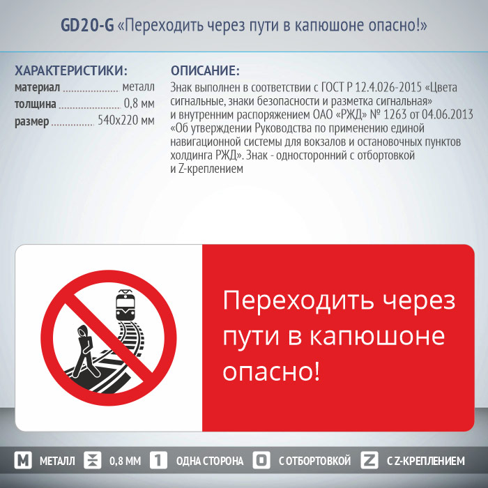 Знак «Переходить через пути в капюшоне опасно!», GD20-G (односторонний горизонтальный, 540х220 мм, металл, с отбортовкой и Z-креплением) в Ачинске купить