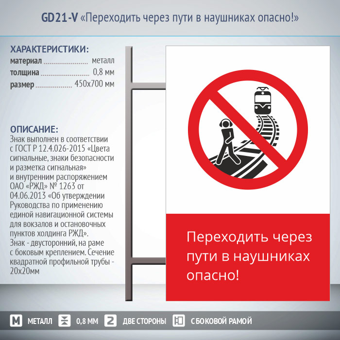 Знак «Переходить через пути в наушниках опасно!», GD21-V (двусторонний вертикальный, 450х700 мм, металл, на раме с боковым креплением) в Ачинске купить