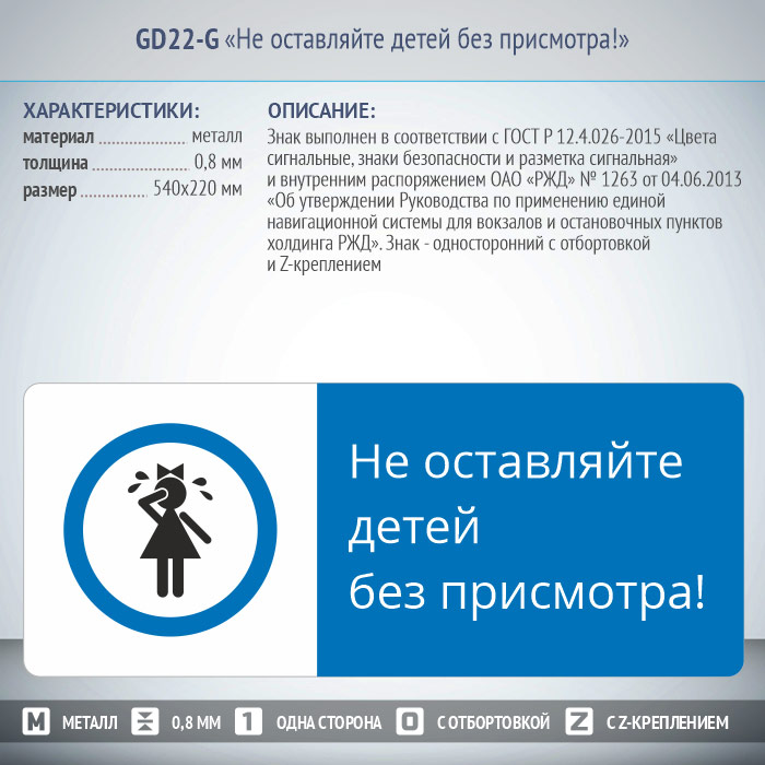 Знак «Не оставляйте детей без присмотра!», GD22-G (односторонний горизонтальный, 540х220 мм, металл, с отбортовкой и Z-креплением) в Ачинске купить