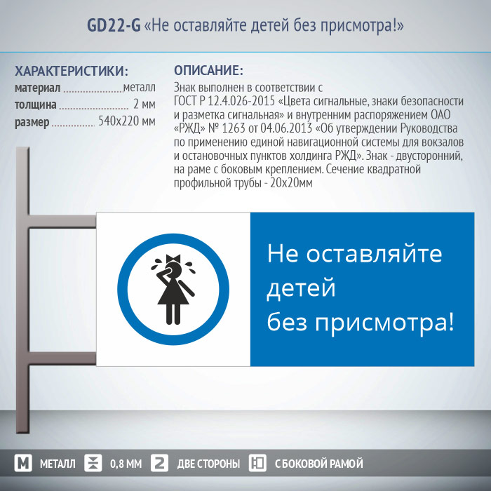 Знак «Не оставляйте детей без присмотра!», GD22-G (двусторонний горизонтальный, 540х220 мм, металл, на раме с боковым креплением) в Ачинске купить