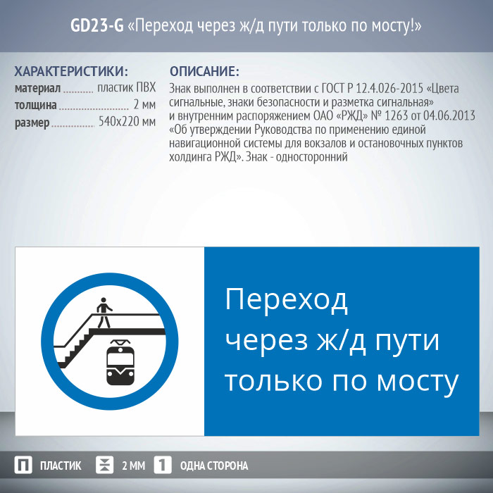 Знак «Переход через ж/д пути только по мосту!», GD23-G (односторонний горизонтальный, 540х220 мм, пластик 2 мм) в Ачинске купить