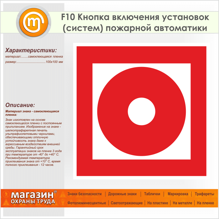 Знак F10 «Кнопка включения установок (систем) пожарной автоматики» (пленка, 100х100 мм) в Ачинске купить