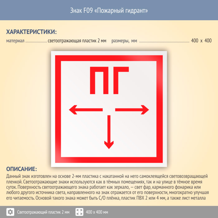 Знак F09 «Пожарный гидрант» (светоотражающий пластик, 400х400 мм) в Ачинске купить