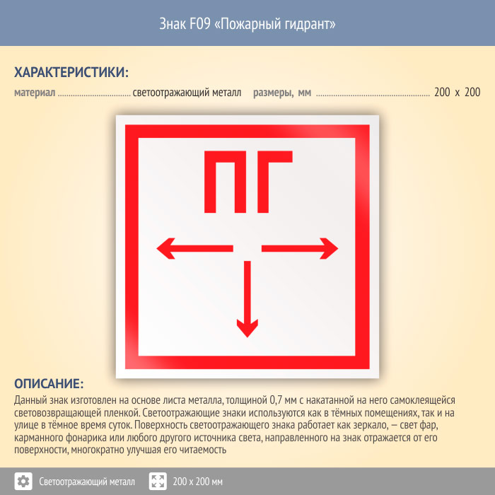 Знак F09 «Пожарный гидрант» (светоотражающий металл, 200х200 мм) в Ачинске купить