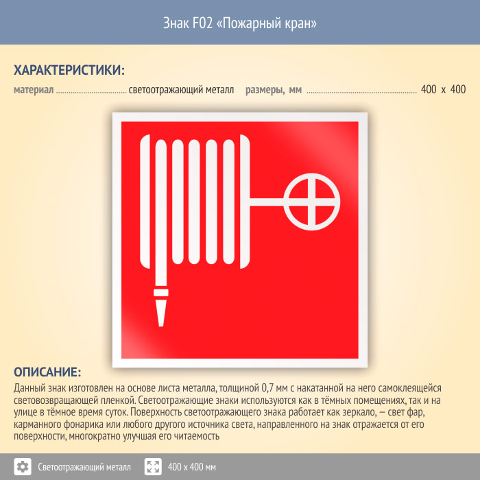 Знак F02 «Пожарный кран» (светоотражающий металл, 400х400 мм) в Ачинске купить