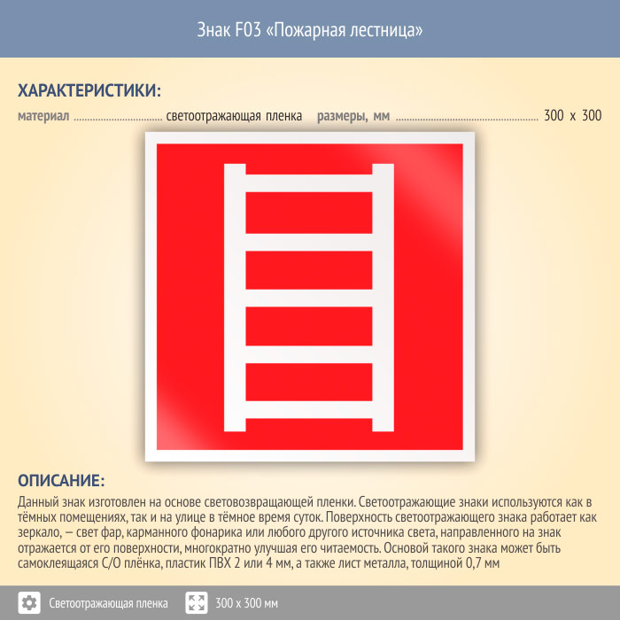 Знак F03 «Пожарная лестница» (светоотражающая пленка, 300х300 мм) в Ачинске купить