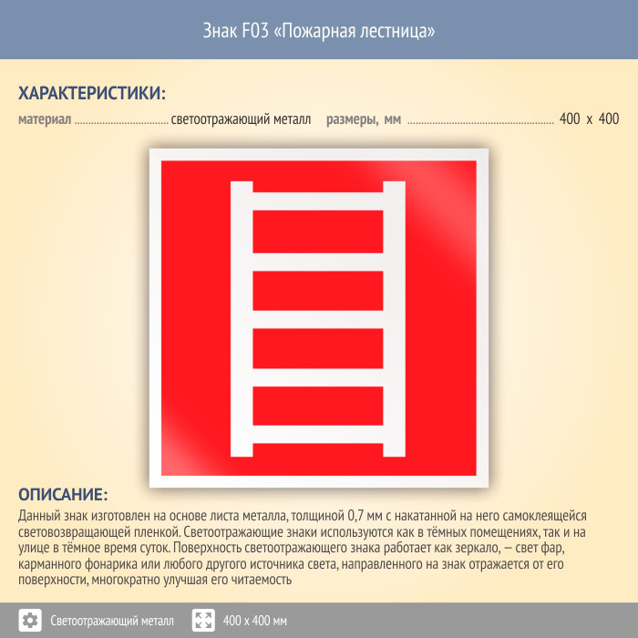 Знак F03 «Пожарная лестница» (светоотражающий металл, 400х400 мм) в Ачинске купить