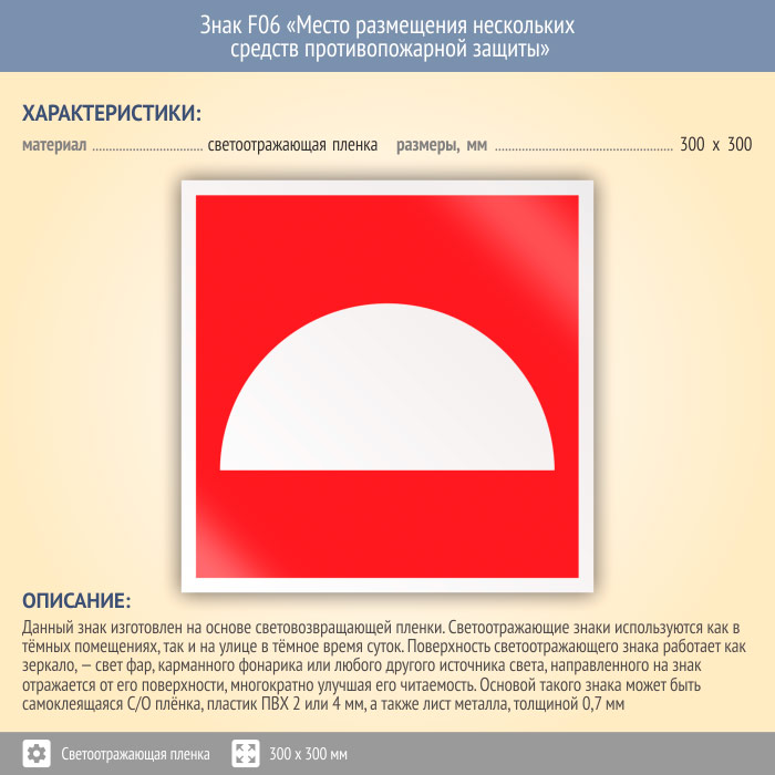 Знак F06 «Место размещения нескольких средств противопожарной защиты» (светоотражающая пленка, 300х300 мм) в Ачинске купить