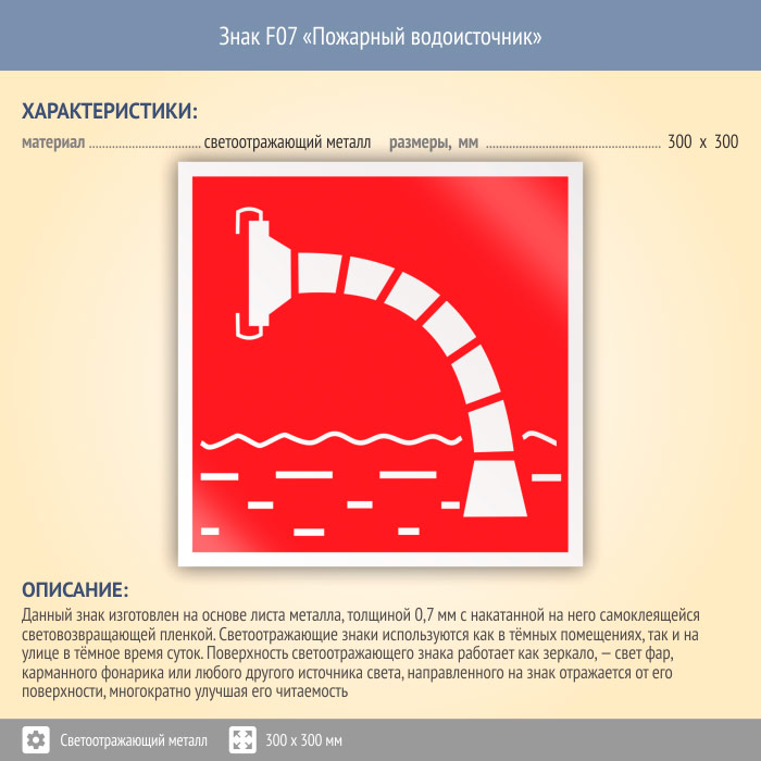 Знак F07 «Пожарный водоисточник» (светоотражающий металл, 300х300 мм) в Ачинске купить
