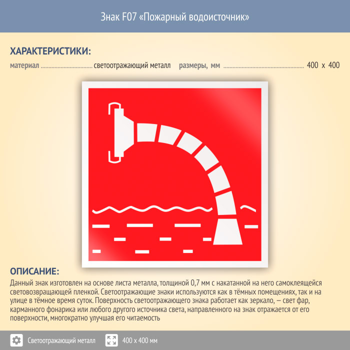 Знак F07 «Пожарный водоисточник» (светоотражающий металл, 400х400 мм) в Ачинске купить