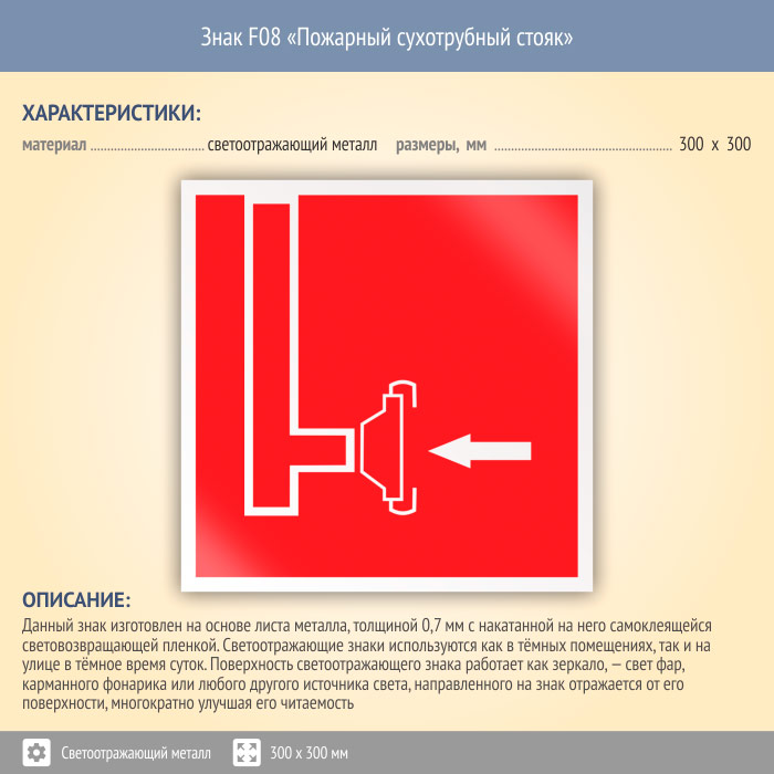 Знак F08 «Пожарный сухотрубный стояк» (светоотражающий металл, 300х300 мм) в Ачинске купить