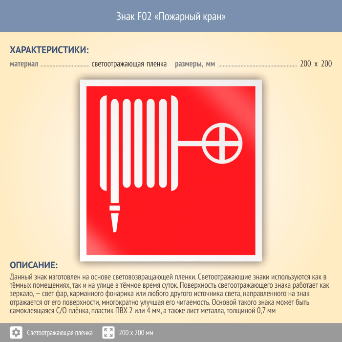 Знак F02 «Пожарный кран» (светоотражающая пленка, 200х200 мм) в Ачинске купить