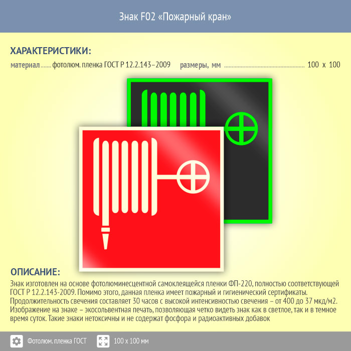 Знак F02 «Пожарный кран» (фотолюминесцентная пленка ГОСТ 34428-2018, 100х100 мм) в Ачинске купить
