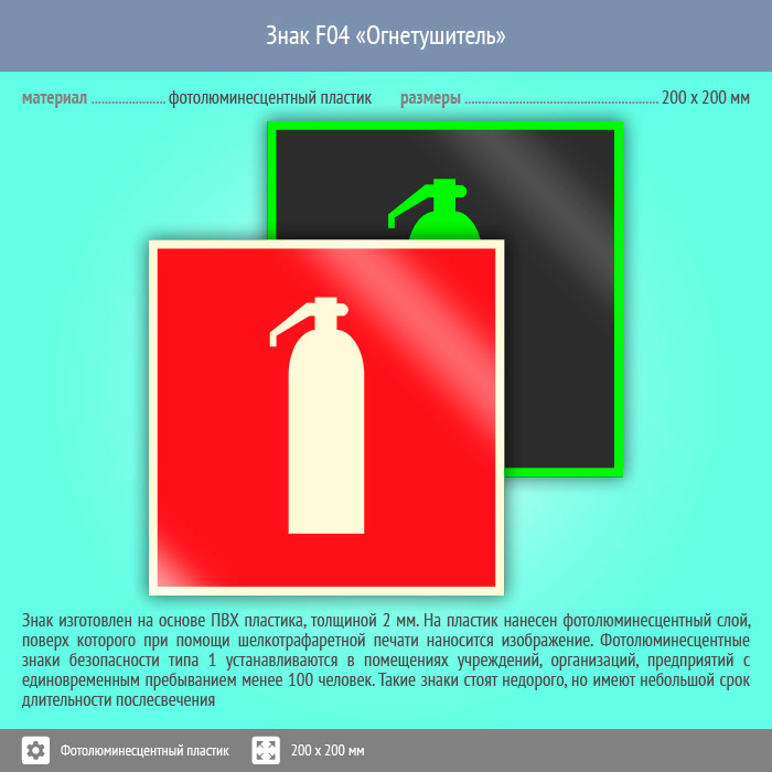Знак F04 «Огнетушитель» (фотолюминесцентный пластик, 200х200 мм) в Ачинске купить