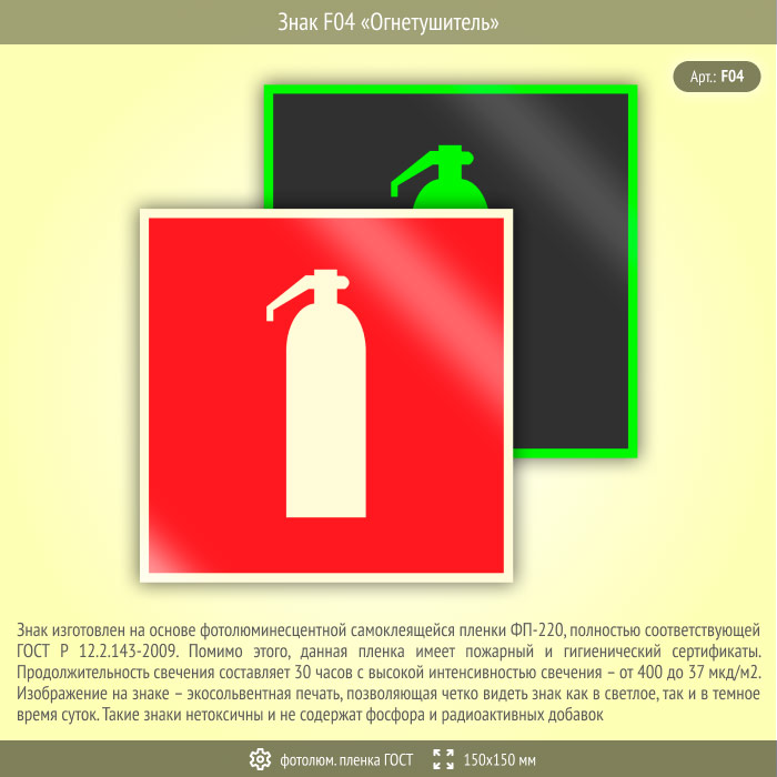 Знак F04 «Огнетушитель» (фотолюминесцентная пленка ГОСТ 34428-2018, 150х150 мм) в Ачинске купить