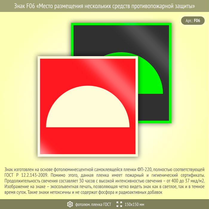 Знак F06 «Место размещения нескольких средств противопожарной защиты» (фотолюминесцентная пленка ГОСТ 34428-2018, 150х150 мм) в Ачинске купить