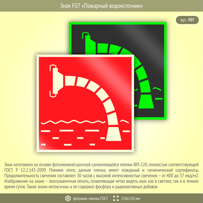 Знак F07 «Пожарный водоисточник» (фотолюминесцентная пленка ГОСТ 34428-2018, 150х150 мм) в Ачинске купить