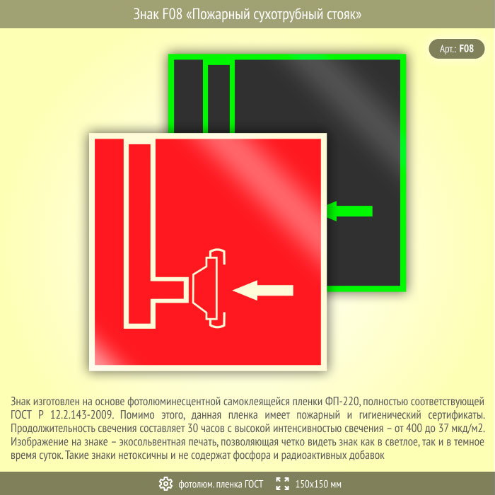 Знак F08 «Пожарный сухотрубный стояк» (фотолюминесцентная пленка ГОСТ 34428-2018, 150х150 мм) в Ачинске купить