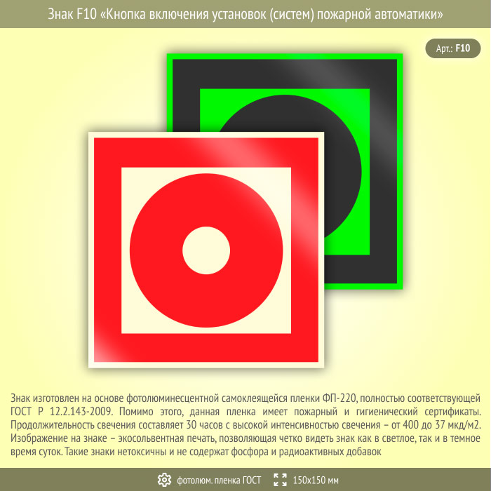 Знак F10 «Кнопка включения установок (систем) пожарной автоматики» (фотолюминесцентная пленка ГОСТ 34428-2018, 150х150 мм) в Ачинске купить
