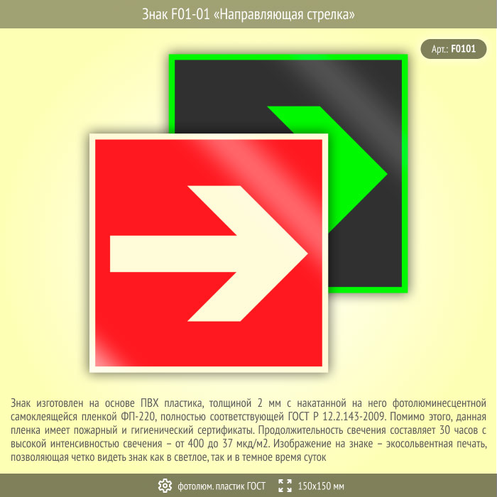 Знак F01-01 «Направляющая стрелка» (фотолюминесцентный пластик ГОСТ 34428-2018, 150х150 мм) в Ачинске купить
