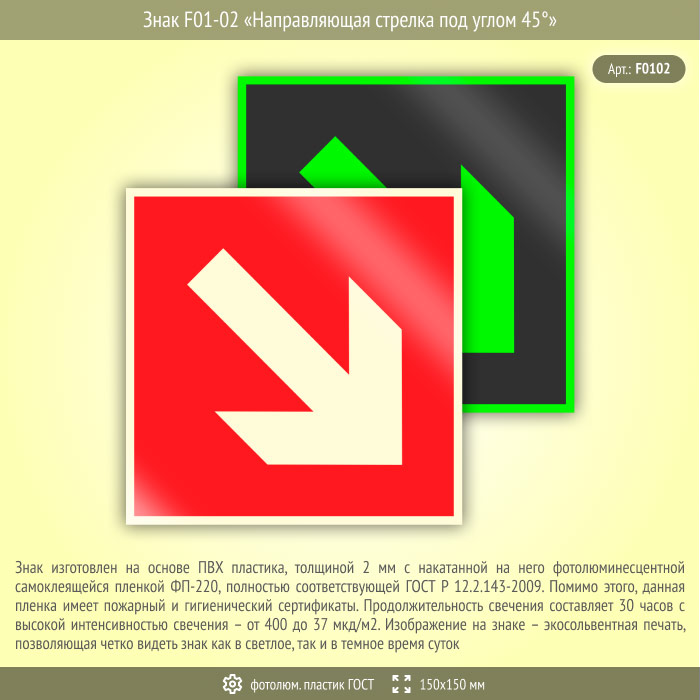 Знак F01-02 «Направляющая стрелка под углом 45°» (фотолюминесцентный пластик ГОСТ 34428-2018, 150х150 мм) в Ачинске купить