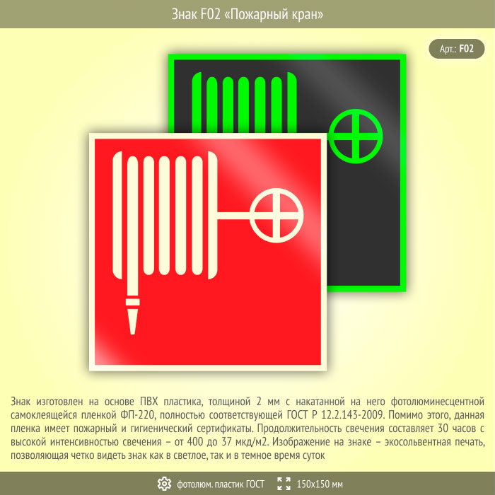 Знак F02 «Пожарный кран» (фотолюминесцентный пластик ГОСТ 34428-2018, 150х150 мм) в Ачинске купить