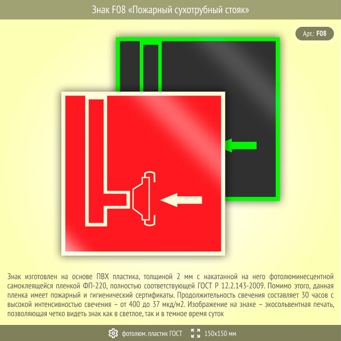 Знак F08 «Пожарный сухотрубный стояк» (фотолюминесцентный пластик ГОСТ 34428-2018, 150х150 мм) в Ачинске купить