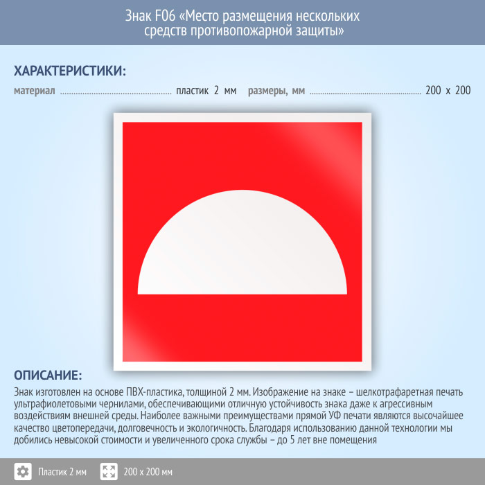 Знак F06 «Место размещения нескольких средств противопожарной защиты» (пластик, 200х200 мм) в Ачинске купить