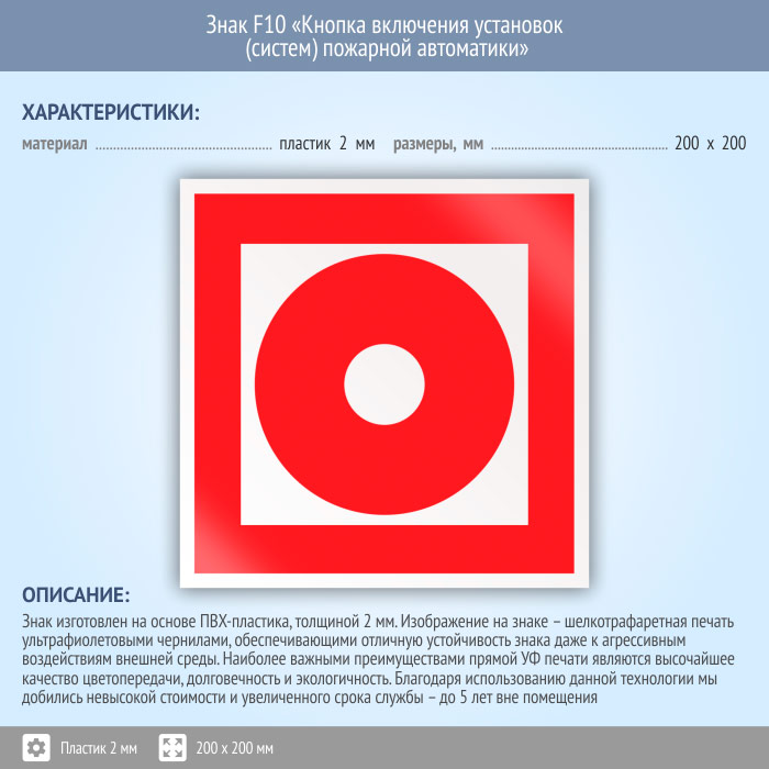 Знак F10 «Кнопка включения установок (систем) пожарной автоматики» (пластик, 200х200 мм) в Ачинске купить