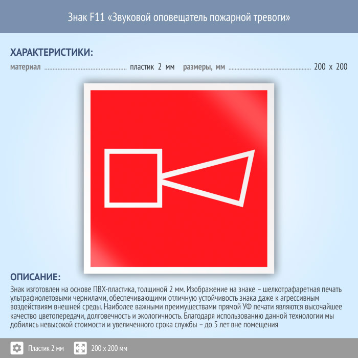 Знак F11 «Звуковой оповещатель пожарной тревоги» (пластик, 200х200 мм) в Ачинске купить