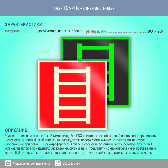 Знак F03 «Пожарная лестница» (фотолюминесцентная пленка, 200х200 мм) в Ачинске купить