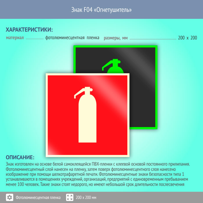Знак F04 «Огнетушитель» (фотолюминесцентная пленка, 200х200 мм) в Ачинске купить