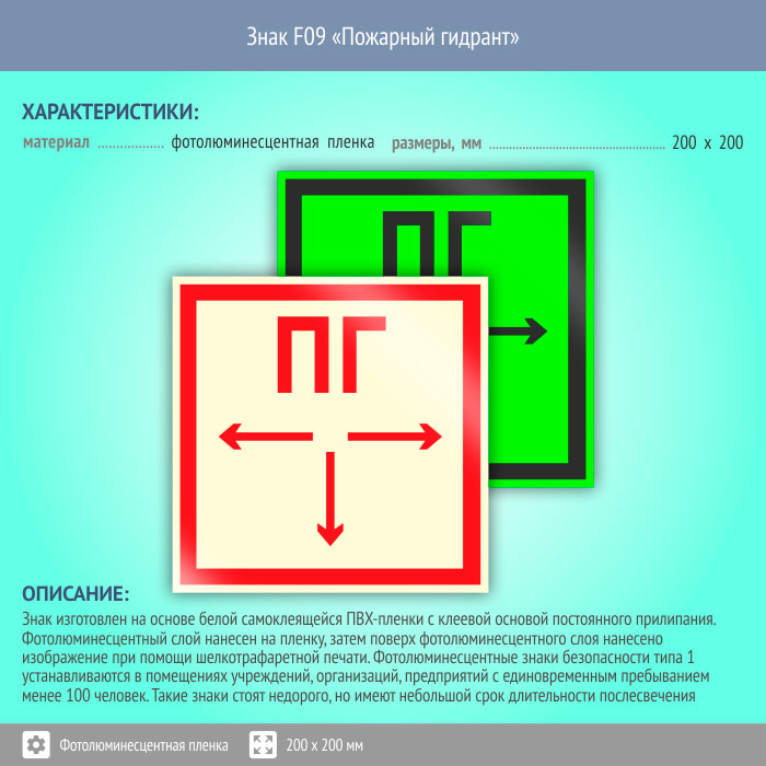 Знак F09 «Пожарный гидрант» (фотолюминесцентная пленка, 200х200 мм) в Ачинске купить