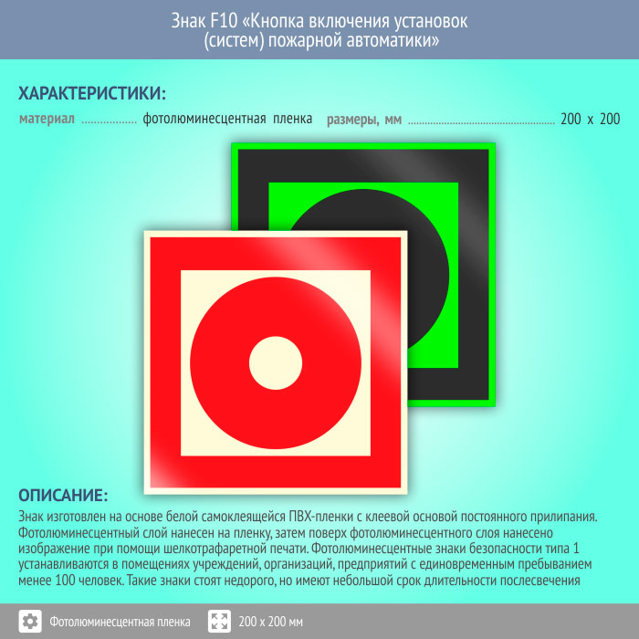 Знак F10 «Кнопка включения установок (систем) пожарной автоматики» (фотолюминесцентная пленка, 200х200 мм) в Ачинске купить
