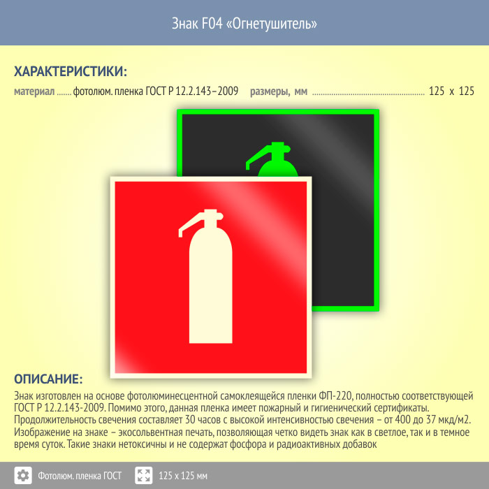 Знак F04 «Огнетушитель» (фотолюминесцентная пленка ГОСТ 34428-2018, 125х125 мм) в Ачинске купить