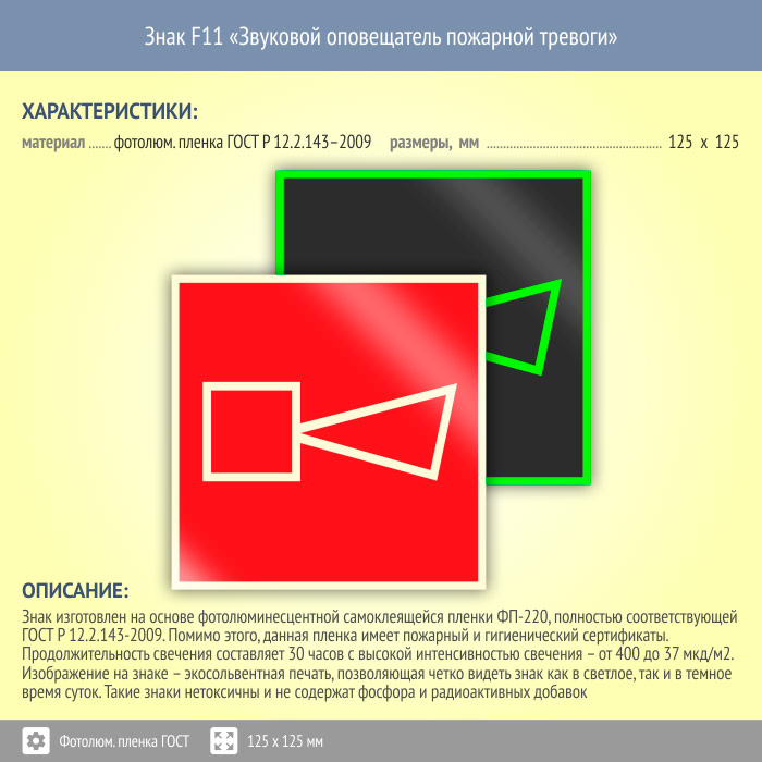 Знак F11 «Звуковой оповещатель пожарной тревоги» (фотолюминесцентная пленка ГОСТ 34428-2018, 125х125 мм) в Ачинске купить