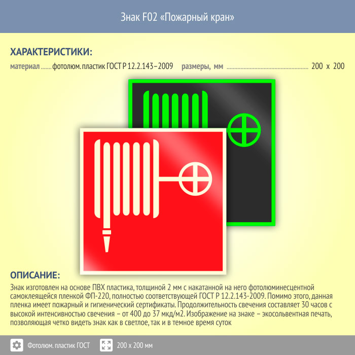 Знак F02 «Пожарный кран» (фотолюминесцентный пластик ГОСТ 34428-2018, 200х200 мм) в Ачинске купить