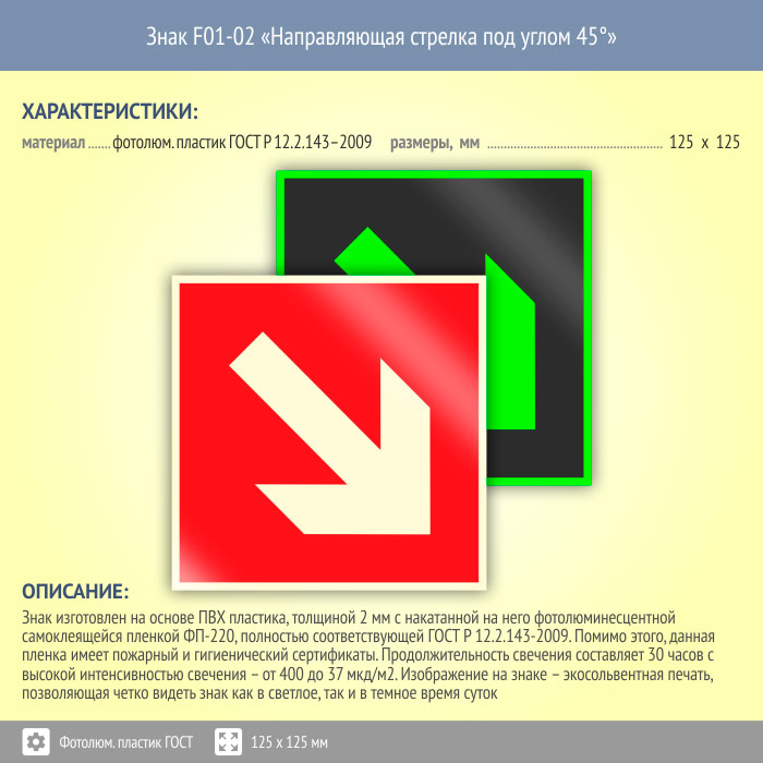Знак F01-02 «Направляющая стрелка под углом 45°» (фотолюминесцентный пластик ГОСТ 34428-2018, 125х125 мм) в Ачинске купить