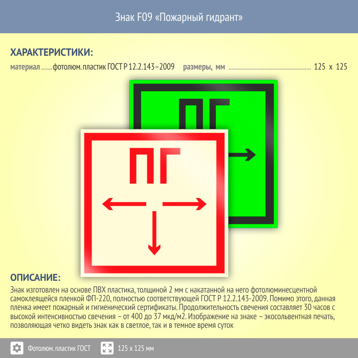 Знак F09 «Пожарный гидрант» (фотолюминесцентный пластик ГОСТ 34428-2018, 125х125 мм) в Ачинске купить