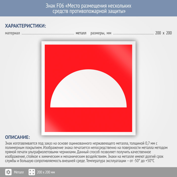 Знак F06 «Место размещения нескольких средств противопожарной защиты» (металл, 200х200 мм) в Ачинске купить