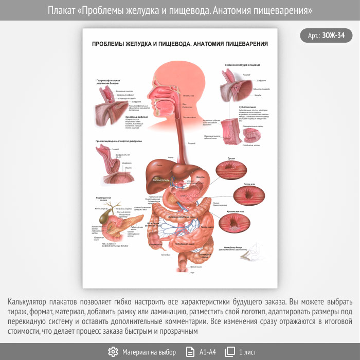 Плакат «Проблемы желудка и пищевода. Анатомия пищеварения» (ЗОЖ-34, 1 лист) в Ачинске купить
